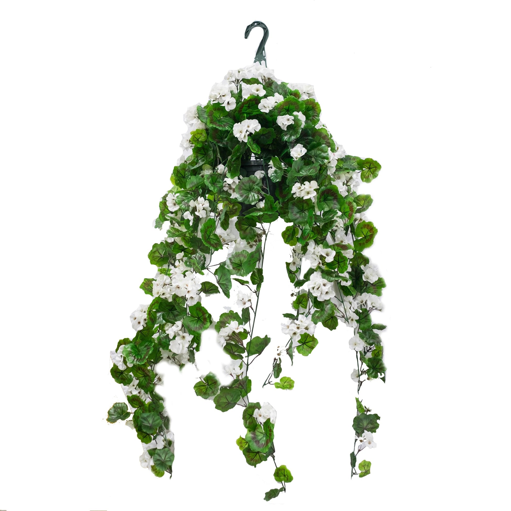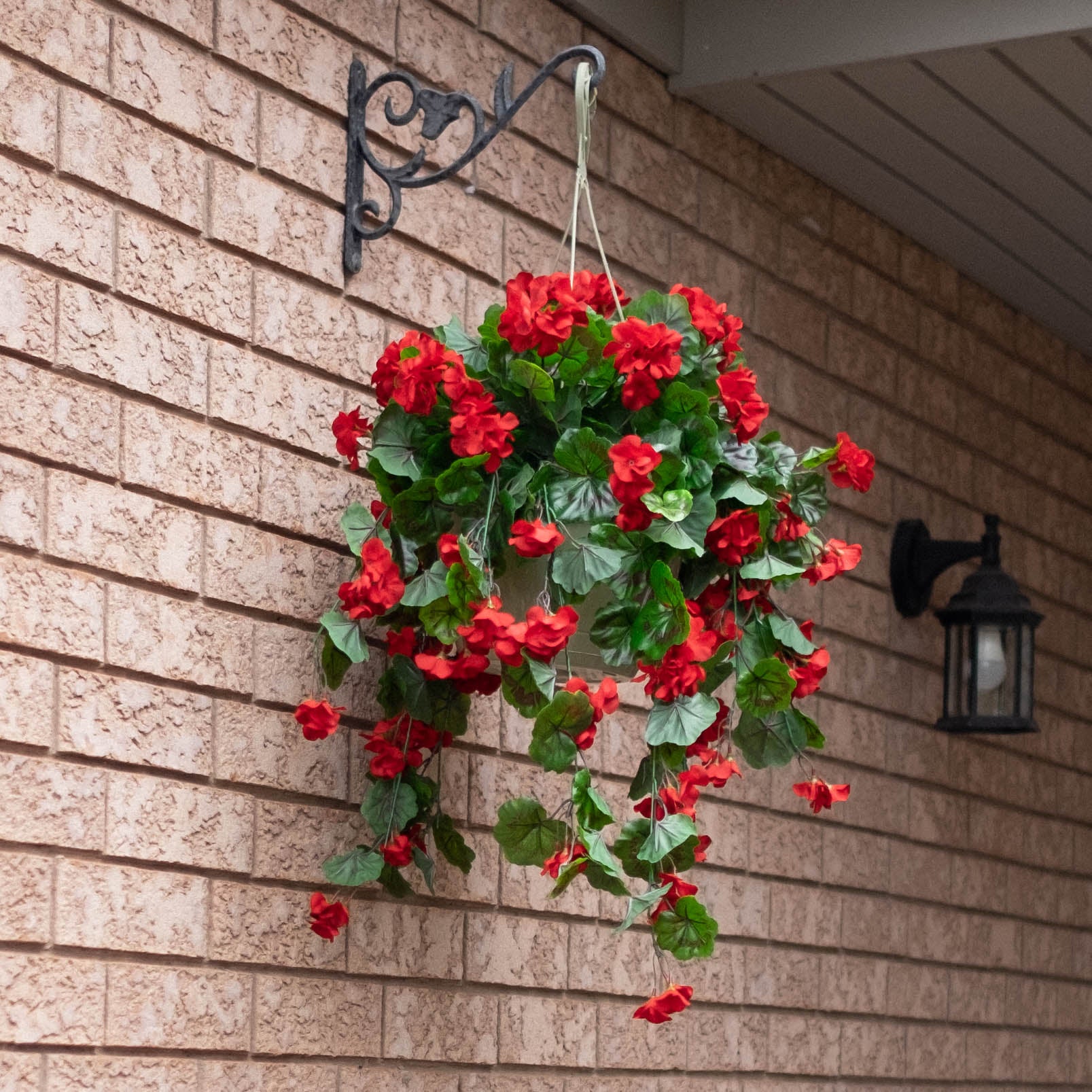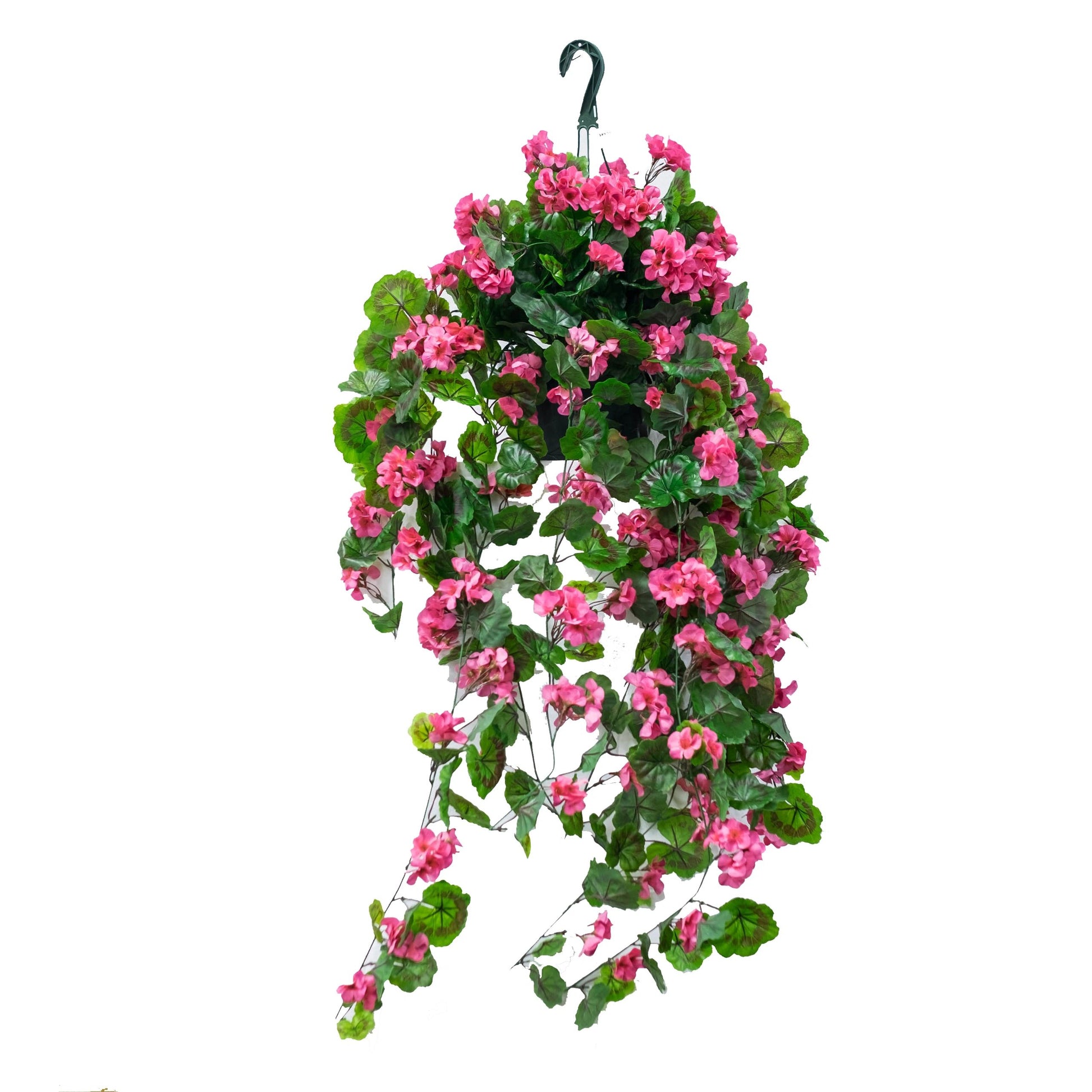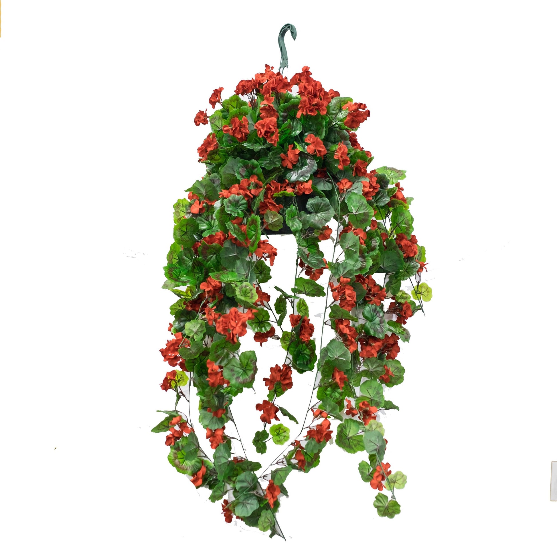 - Enjoy long-lasting beauty with our lush Geranium Flowering Basket, featuring vibrant geraniums and lifelike green leaves—an elegant addition to your collection of faux florals.