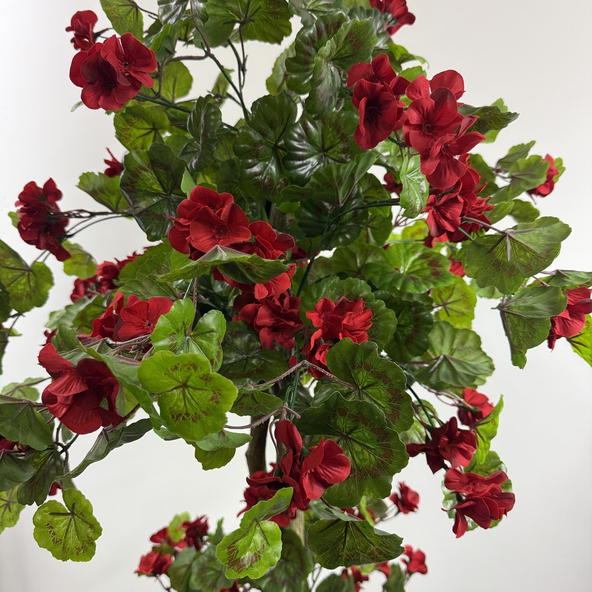 This 5.5' flowering geranium topiary is a beautiful addition to any space—indoors or out. As part of our premium fake flower arrangements, it’s UV protected to maintain its vibrant look in any setting. Easily placed into a larger decorative planter, each piece is professionally handcrafted in-store by our trained staff for a realistic and polished finish.