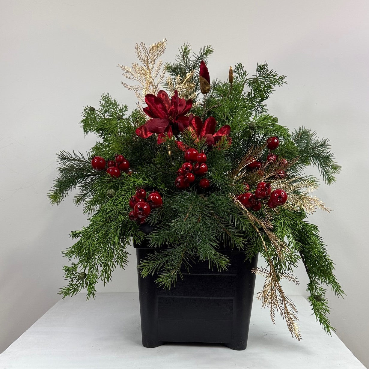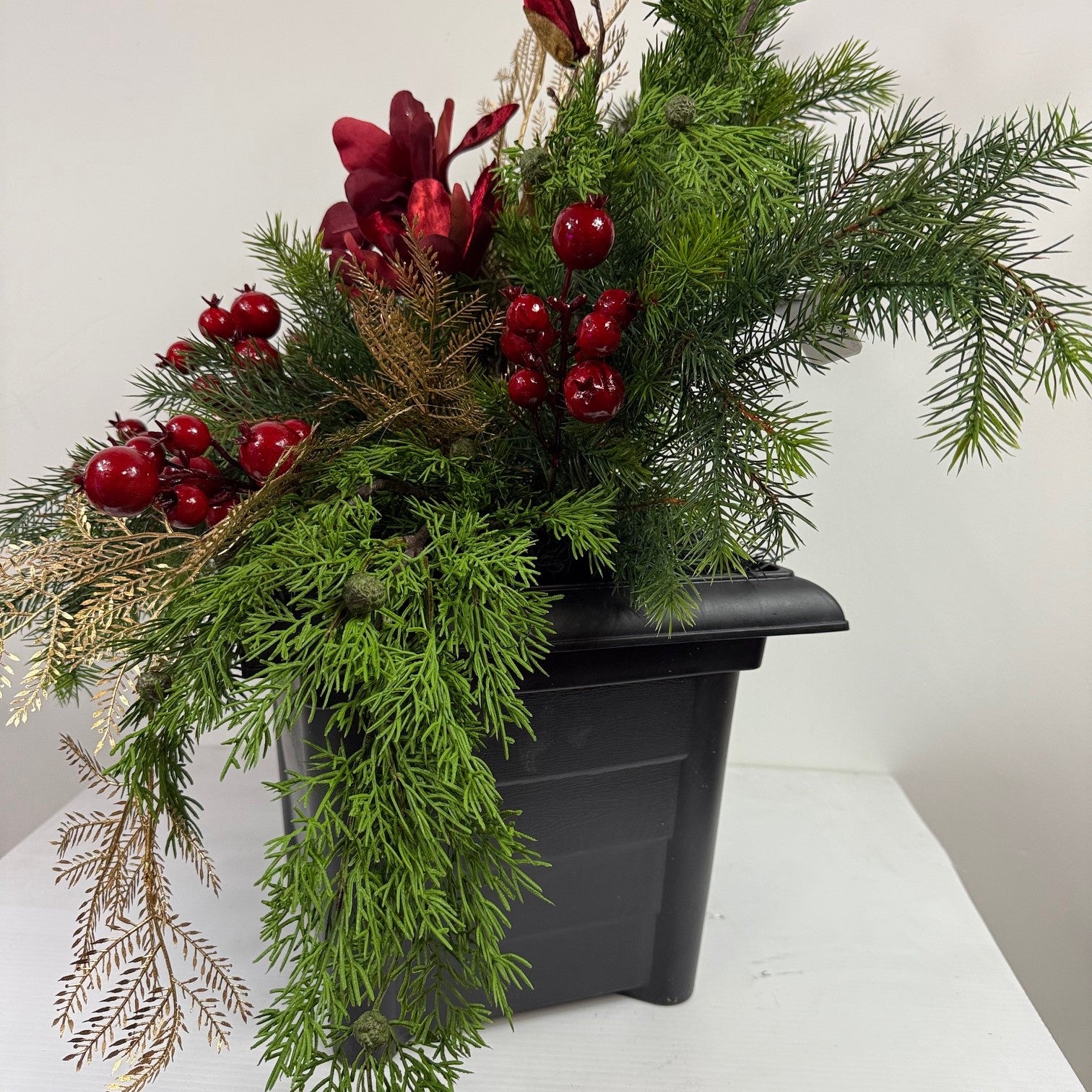 - UV-protected seasonal greenery brings the arrangement to 24" tall, cascading into mixed greens and berries. Built on three sides, it’s designed to sit in front of a wall or post.