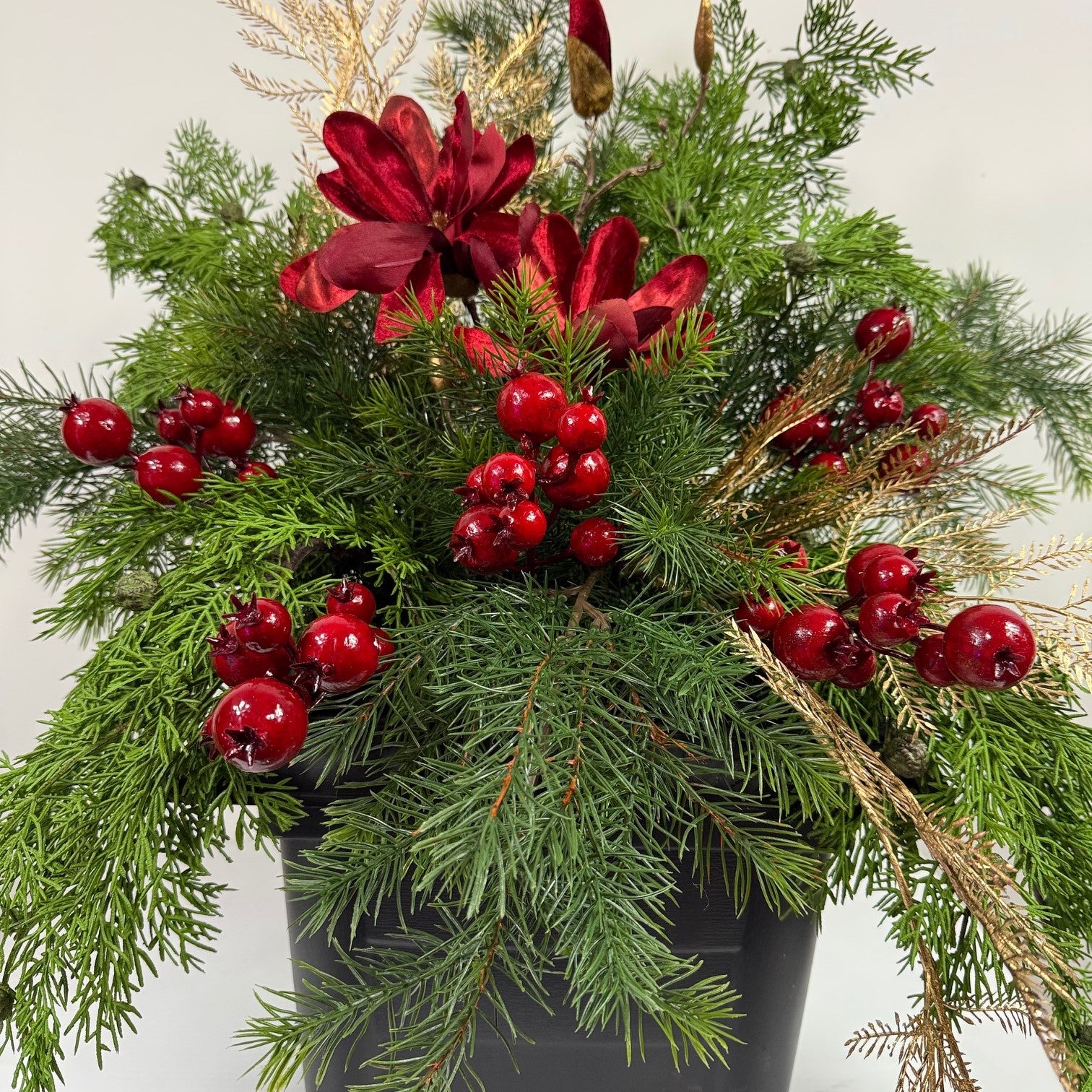 Introduce a special piece in our collection of outdoor artificial seasonal arrangements. Blending Large rich red berries, pine and cedar boughs. Velvet Magnolia and gold leaf trim, A rich mix of textures and colors adds elegance and charm to any space.