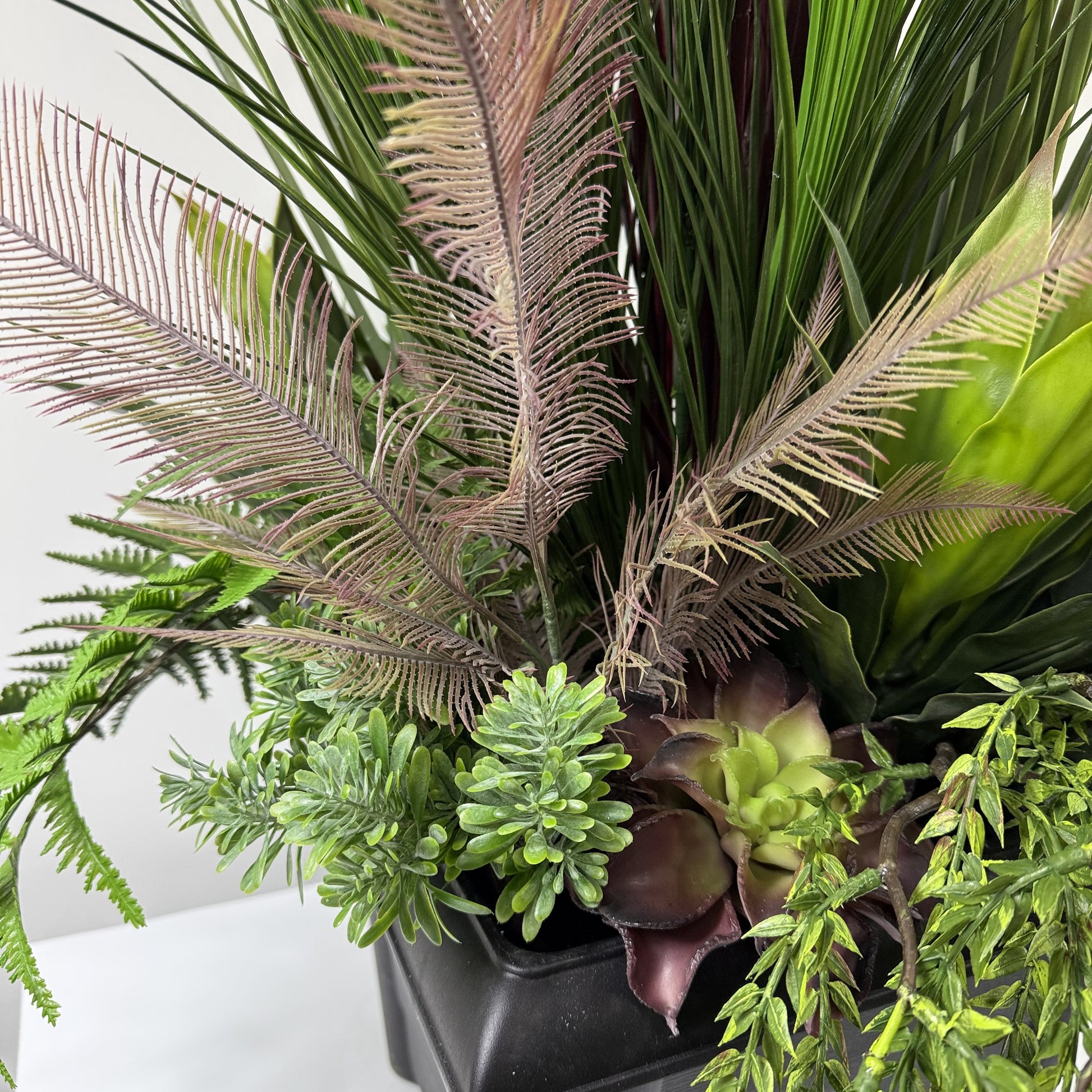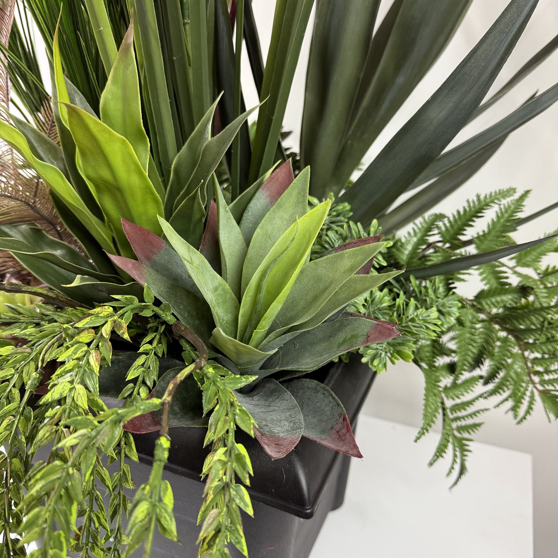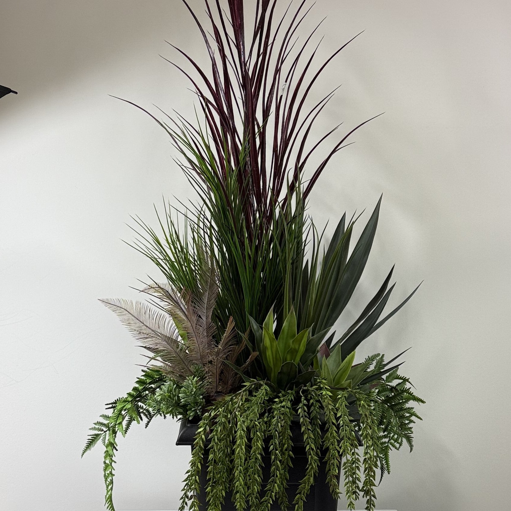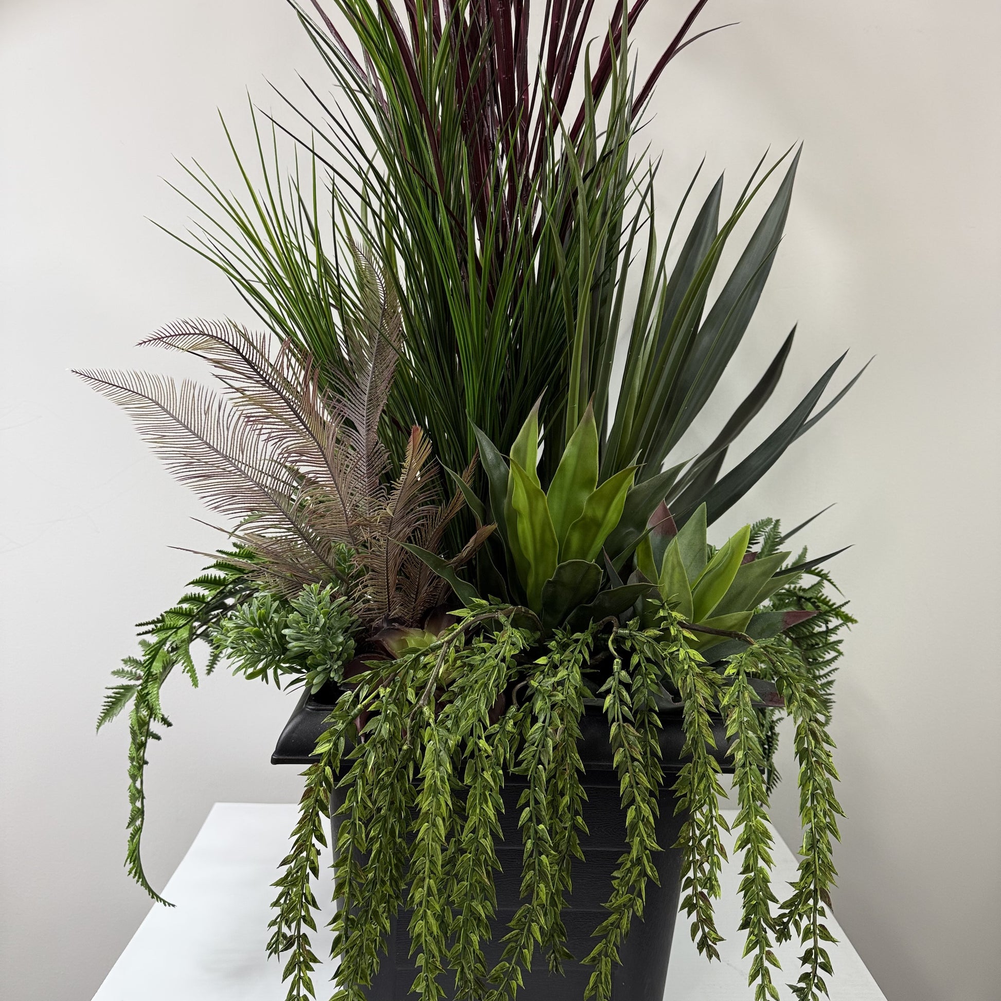 A custom 360  arrangement filled with  Full on Succulent and agave insert with red and green grass and ferns. Grass roots was created as a 4-sided arrangement, Perfect for up around deck or pool. The plants are secured into a 14" square black plastic insert for use with your existing planters