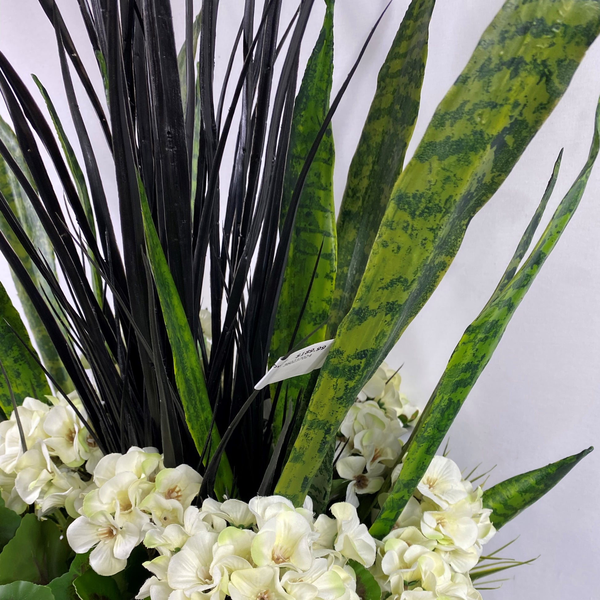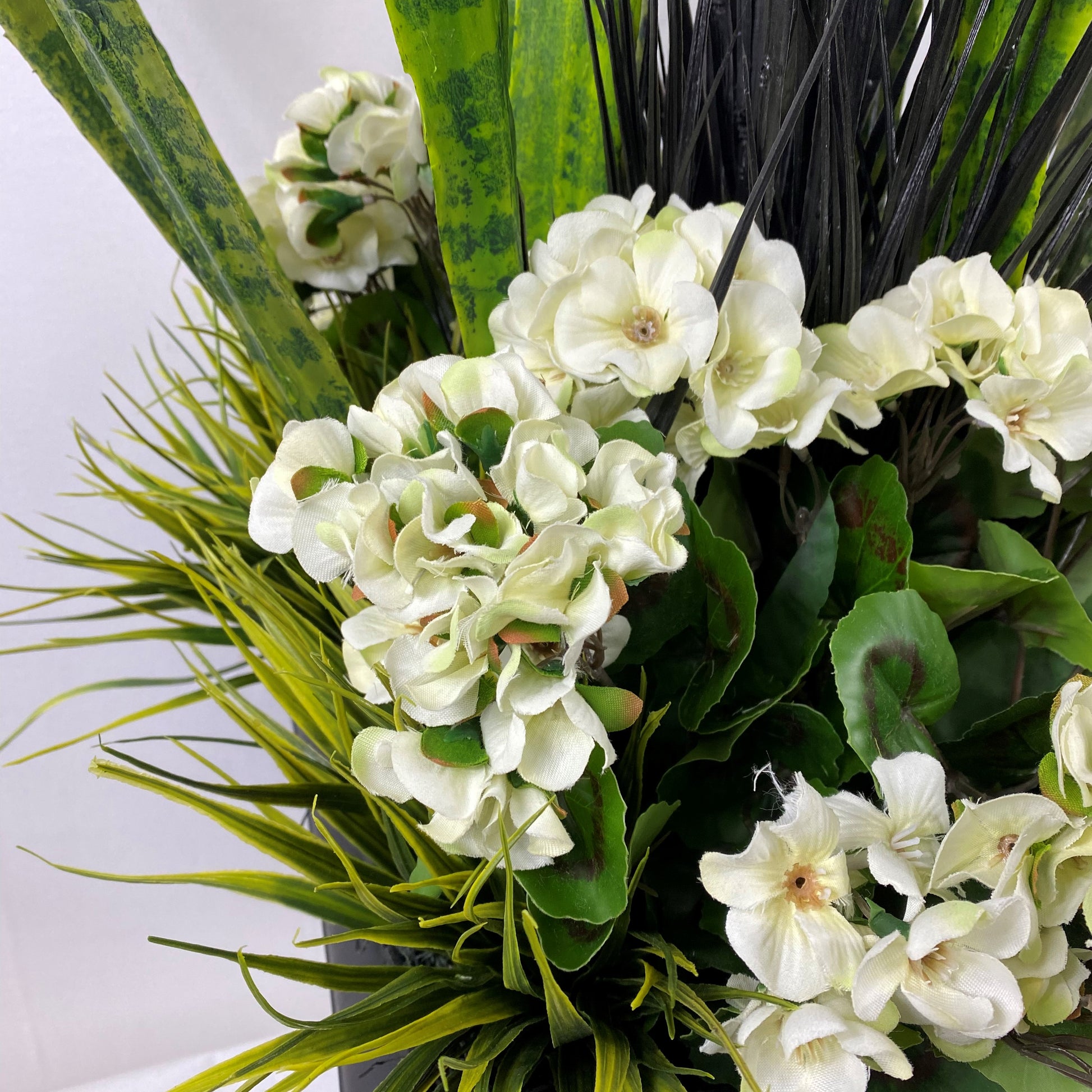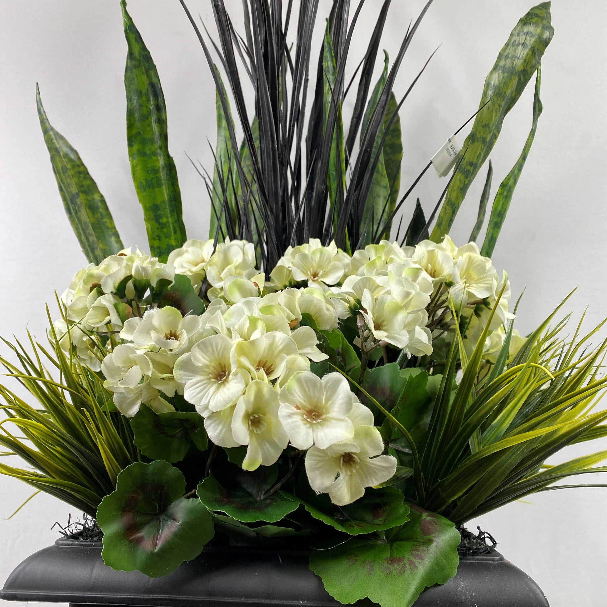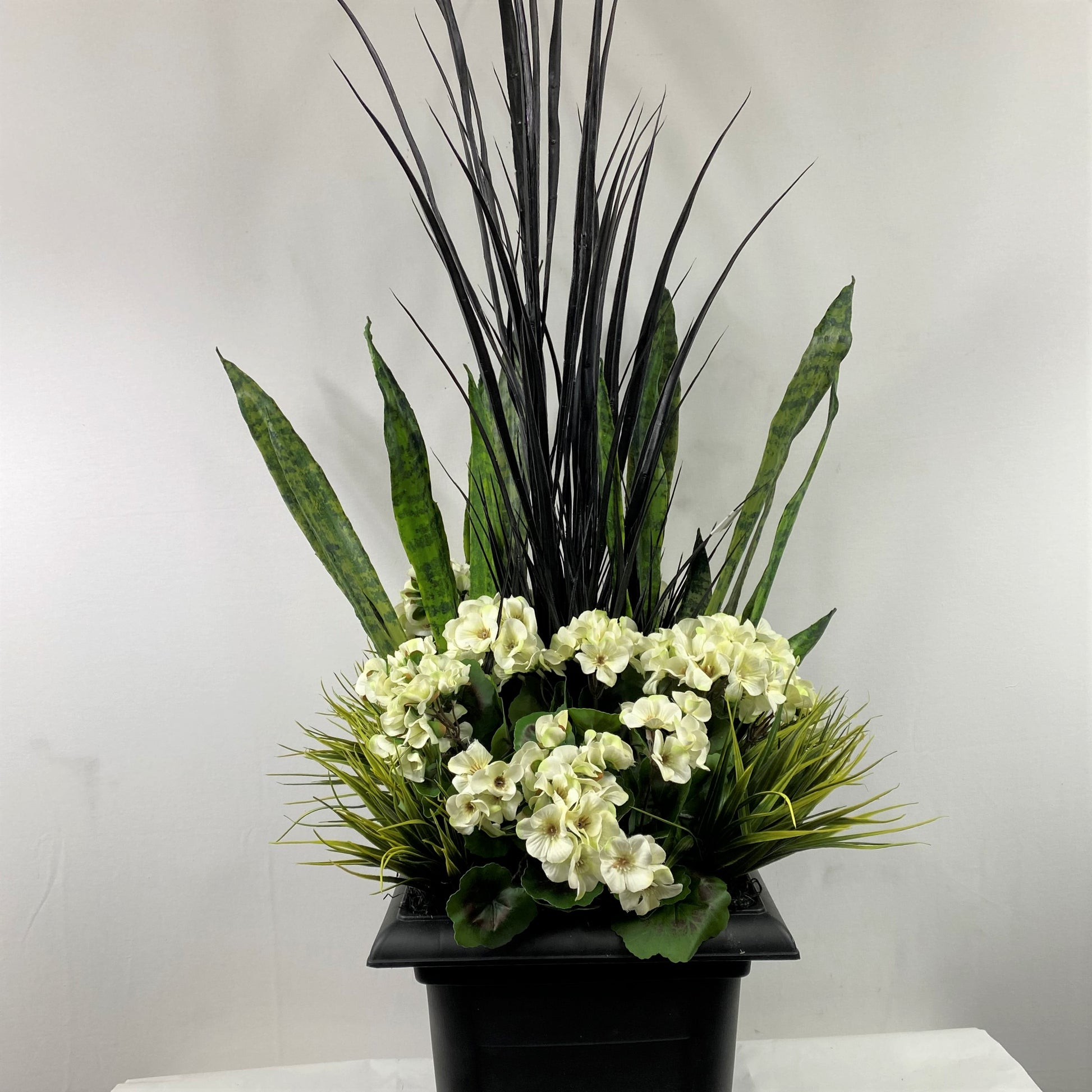 Classic greens and white geranium insert with Sanseveriua and black grass Created to be a 4 sided arrangement prefect for front of house, front of garage or near the pool. The plants are secured into a 12" square black plastic insert for use with your existing planters